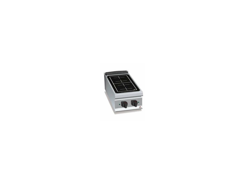 Indukční keramická varná deska, (obdelníková varná deska pracující přes dvě zóny) tloušťka 6 mm (snadná každodenní údržba bez použití abrasivních prostředků). Maximální úspora energie, vytápění jednotlivých varných ploch (270x310 mm) je pouze při kontaktu hrnce s varnou plochou. Velikost topných zón je samo-regulovana podle průměru nádobí. Při odstranění nádobí z povrchu je automaticky přerušeno vytápění. Elektronická regulace teploty potenciometrem. Model TOUCH s dotykovým elektronickým ovládáním.