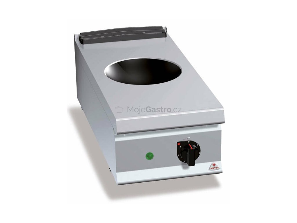 Indukční keramická varná deska “wok” (snadná každodenní údržba bez použití abrasivních prostředků). Maximální úspora energie, vytápění varné (výkon 5 kW) plochy je pouze při kontaktu s pánví s varnou plochou. Při odstranění pánve z povrchu je automaticky přerušeno vytápění. Elektronická regulace teploty potenciometrem.