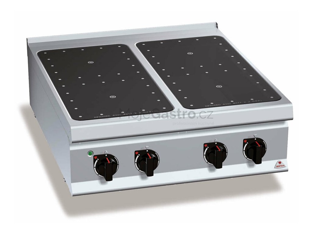 Keramická varná deska tloušťka 6 mm. Elektrická topná tělesa o Ø270 mm a výkonu 4kW dosahují při vaření v kruhových zónách vysokých teplot (do 500°C). Plochy zón jsou označeny speciálním serigrafem, dle kterého je určena správná poloha hrnce. Světelná signalizace zbytkového tepla do 60°C při vypnutí každé zóny pro ochranu uživatele.