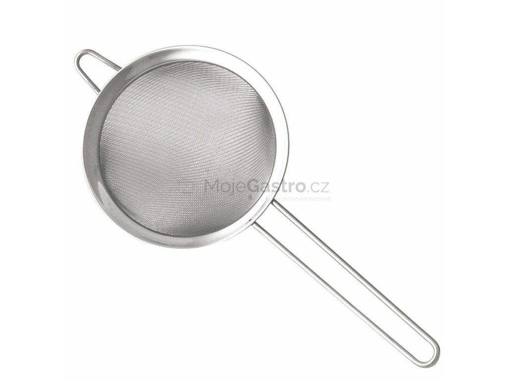 Profesionalní celonerezový cedník síto a rukojetí s možností zavěšení pro snadné přecedění látek.