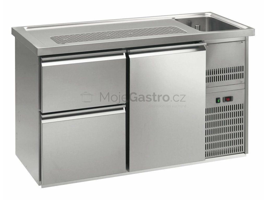 Barový a výčepní stůl - dvousekcový. Model v celonerezovém provedení vč.prolisované pracovní desky (AISI 304) s dřezem (300x500x300mm) nad agregátem a odkapem (950x250mm) pod výčepní stojan. Digitální ovládání, nucená cirkulace vzduchu, automatické..
