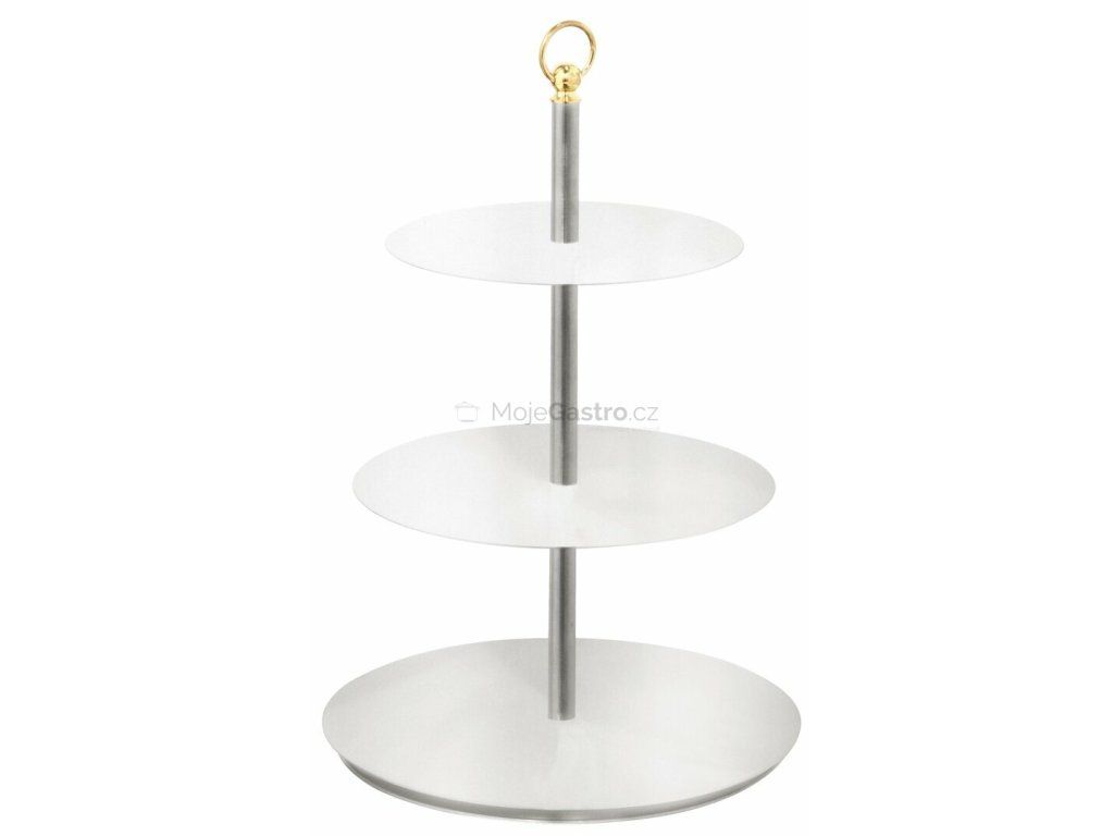 Třípatrový etažér na dezerty v nerezovém provedení. Hmotnost 2,9.