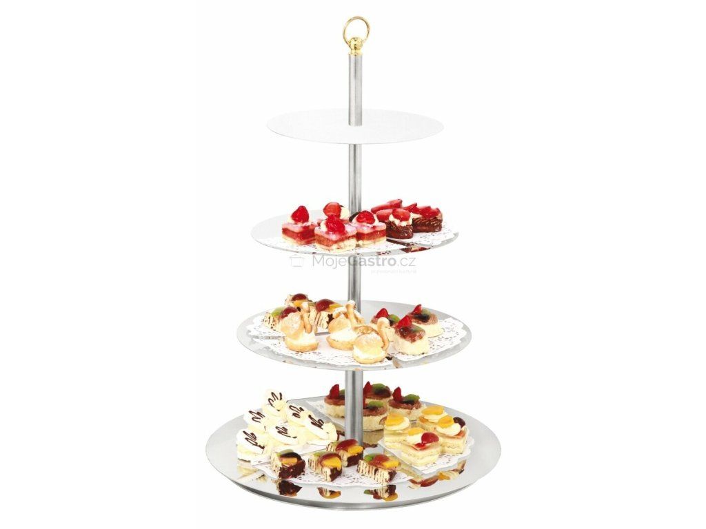 Čtyřpatrový etažér na dezerty v nerezovém provedení. Hmotnost 4,7.
