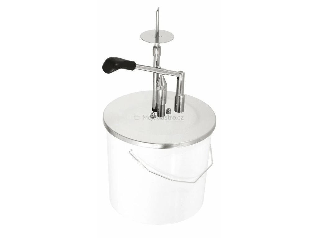 K nasazení na plastové vědro, které je součástí balení. Nerezová pumpa a plnící jehla. Vědro o objemu 5 litrů.