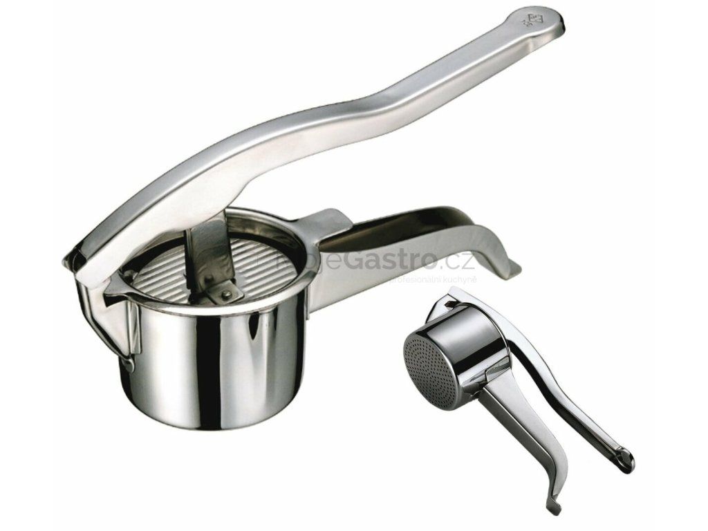 Masivní nerezové mačkadlo brambor o průměru komory 90 mm a celkové délce 280 mm.
