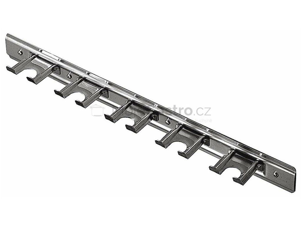 Nástěnný věšák na pizza lopaty, hrabla nebo košťata je vyroben z nerezu a dodáván ve velikostech se 3-mi až 5-ti háčky.