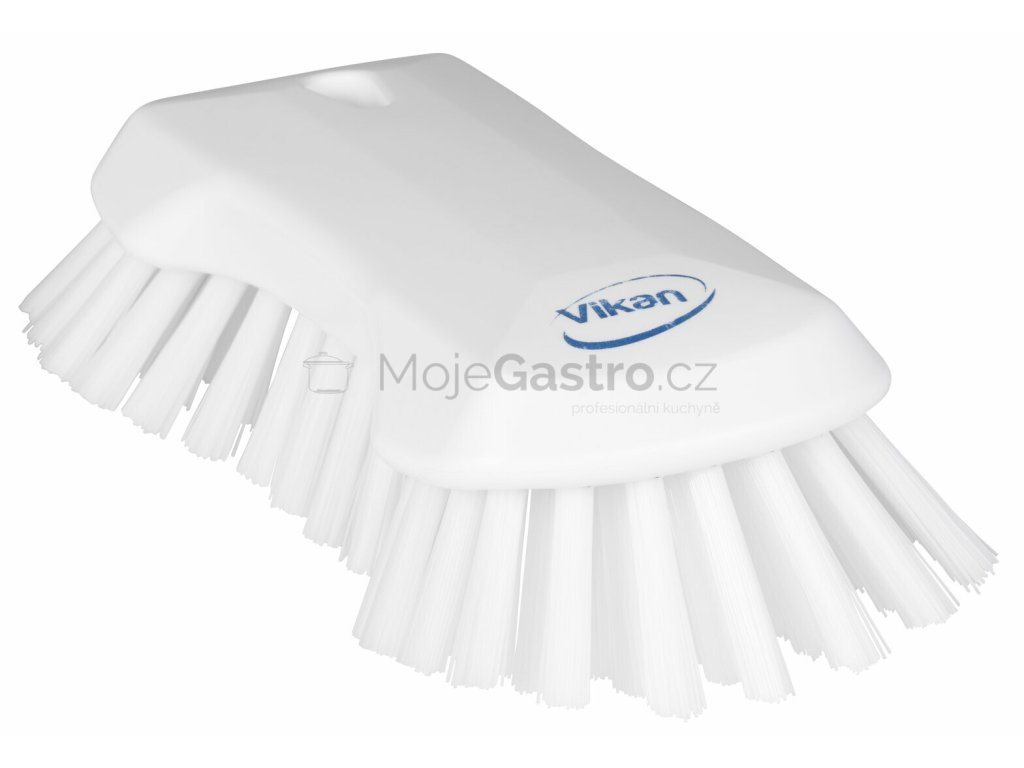 Ruční kartáč XL se stal extrémně oblíbeným v masném a mlékárenském průmyslu a díky své velikosti a tuhým štětinám odvádí působivou práci. Pokud potřebujete vyčistit větší plochy s těžko dostupnými rohy nebo mezerami, tento velký kartáč může být právě tím nástrojem, který potřebujete. Robustní kartáč se skládá z pevného bloku 29 mm. Speciální „motýlí tvar“ bloku nabízí uživateli lepší a ergonomičtější úchop. Kartáč sedí v jedné rovině s rukama většiny uživatelů, takže se pohodlně a snadno drží, i když manipulujete s čisticími chemikáliemi a když jsou ruce mokré nebo mastné. Stejně jako všechny kartáče z naší hygienické řady je i ruční kartáč Vikan XL navržen pro použití v oblastech, kde jsou důležité nejvyšší standardy čistoty a hygieny. To z nich dělá ideální čisticí nástroj pro potravinářský průmysl. Hladký povrch, absence ostrých hran a šikmý, vypouštěcí otvor pro zavěšení usnadňují čištění a skladování. Ať už čistíte nádrže, stoly, dopravníky nebo kbelíky, ruční kartáč XL s extra tuhými štětinami vám pomůže dokončit práci rychle a efektivně.