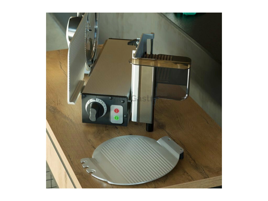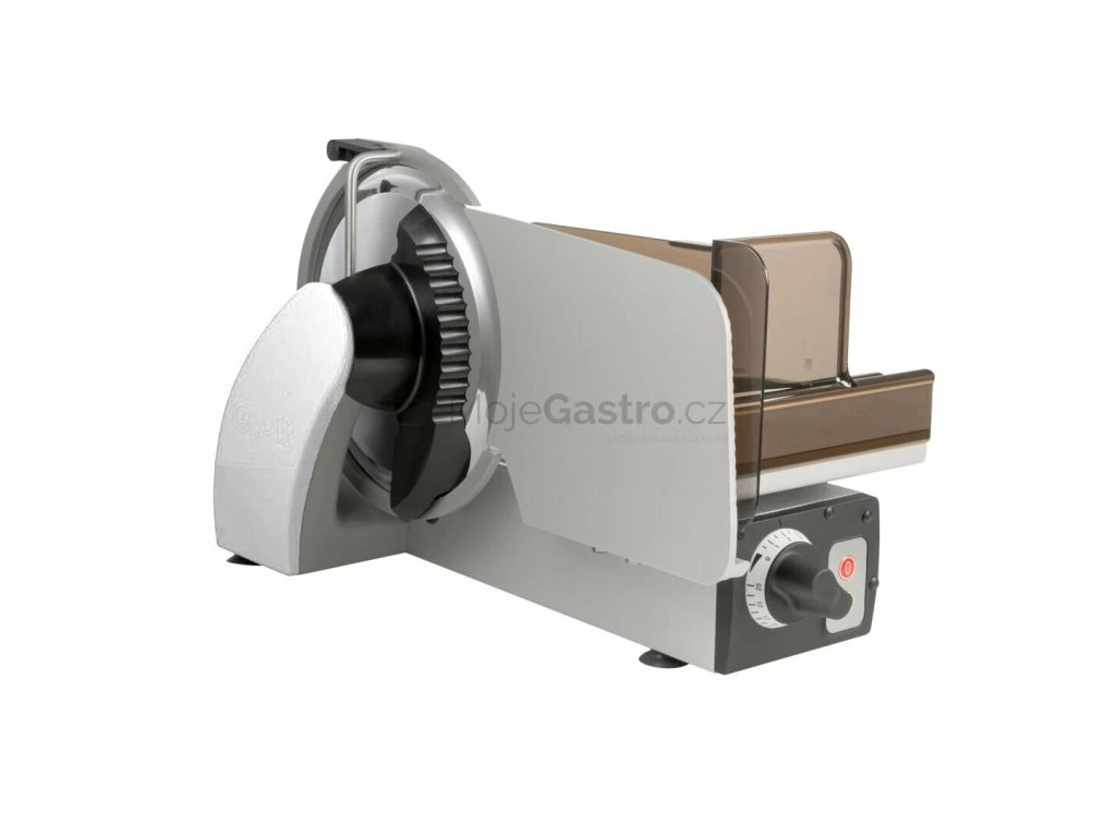 Nářezový stroj manuální pro profesionální použití na porcování a krájení různých produkt (uzeniny, maso, sýr, chléb, zeleninu a ovoce). Vhodný pro gastronomické provozy a menší prodejny. Opravdový multitalent se šírokým spektrem využití. Promyšlená konstrukce stroje zabezpečí nejlepší výsledky krájení, optimální přístup a komfort při čistění. Vysoký hygienický standard. Účinný systém chlazení motoru a hybridní pohon (šneková převodovka pohánějící klínový řemen) umožňuje efektivní a bezúdržbový přenos energie i při nepřetržitém provozu. Důmyslný "L" design umožňuje šikovnou kombinaci a těsné seskupení s úložnými tácky, krájecími deskami, nebo s váhou atd. Maximální řezná kapacita s minimální stopou, přesné a praktické nastavení tloušťky řezu od 0 až do 20mm.