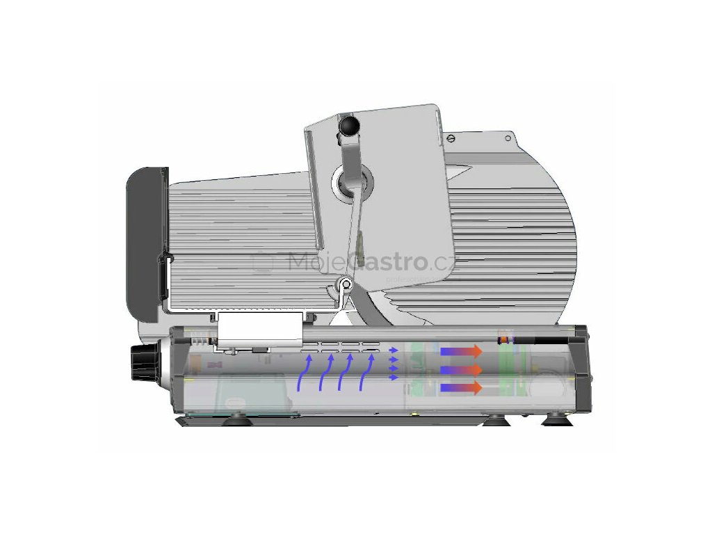 Pohon nářezového stroje zajišťuje výkonný 300 W motor (tichý, účinný, dobře chlazený hybridní pohon umožňuje efektivní a bezúdržbový přenos energie i při nepřetržitém provozu)