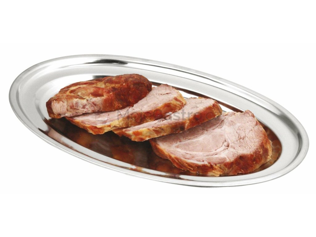 Oválný nerezový tác s vyvýšeným okrajem. Dodáváno v 5-ti velikostech.