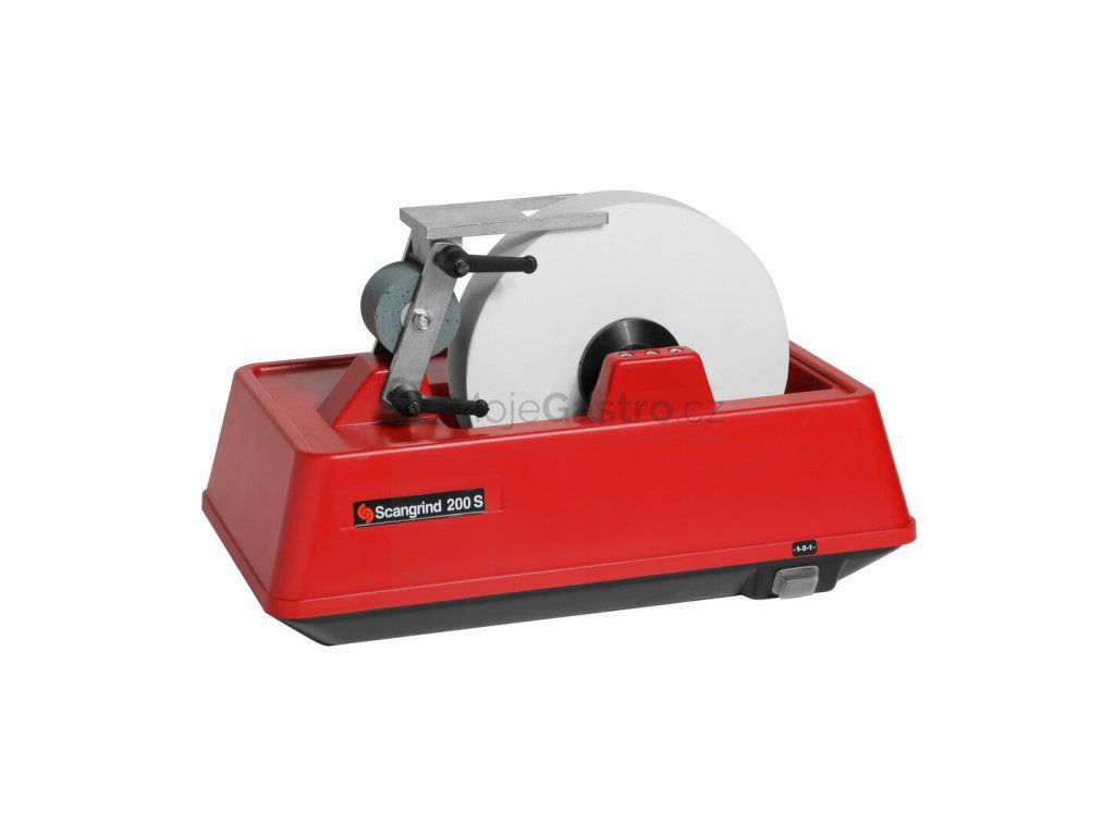 Brus pro mokré broušení. Brusný kámen o průměru 200 mm je namáčen do vody.