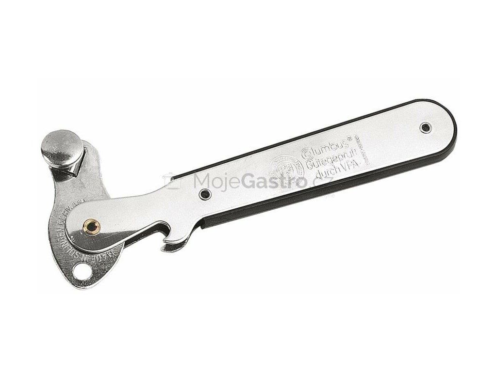 Jednoduchý otvírák konzerv v kovovém provedení s rozměry 165x25 mm.