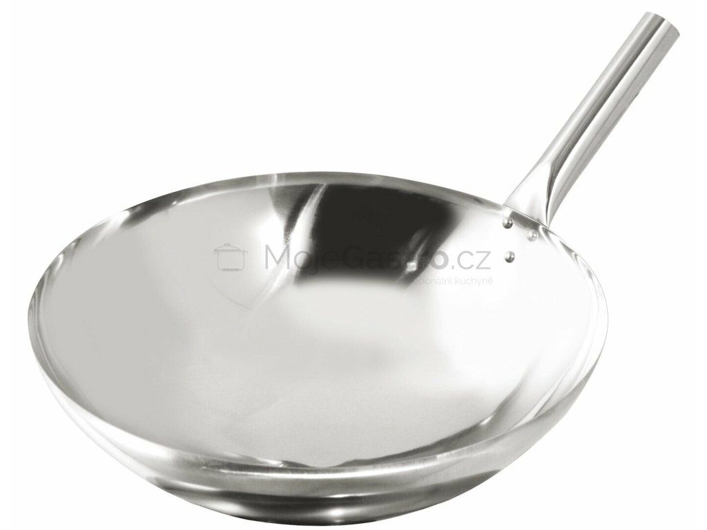 Profesionální pánev WOK z nerez materiálu o tloušťce 1,2 mm s oblým dnem je určená pro všechny druhy plynových sporáků.
