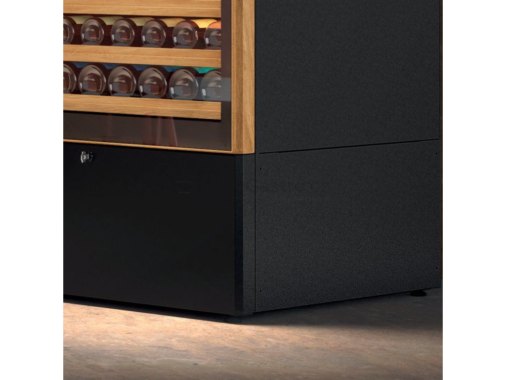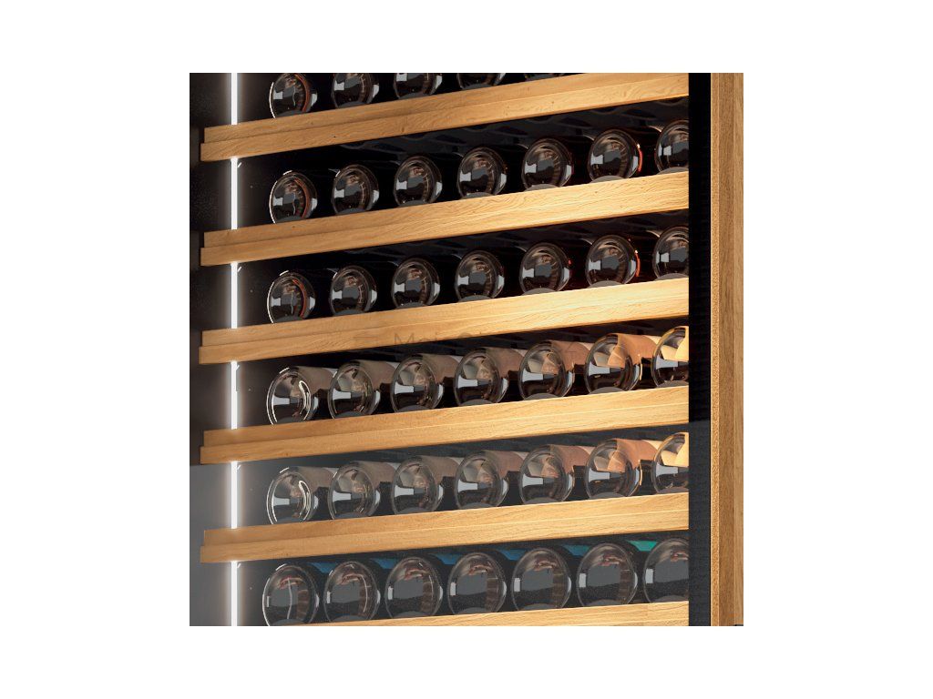 Profesionální dvouzónová vinotéka s plnou hloubkou a výškou, určená pro provozy, kde se spojuje maximální kapacita, přesná regulace teploty a elegantní vzhled. Model M7L_DV je vybaven technologií DUALVENT – dvěma nezávislými chladicími okruhy pro oddělené skladování bílých a červených vín. Dřevěná police dodává vitríně hřejivost, eleganci a podtrhuje její sofistikovaný vzhled. V ceně jsou 2 police na stojící láhve (každá po 65 ks). V případě zájmu je možnost zakoupení i jiných polic. Plášť je vyroben z recyklovaných materiálů, které lze po skončení životnosti opět ekologicky zpracovat.