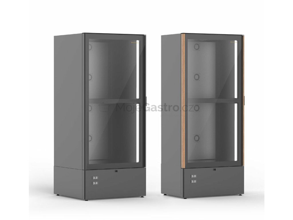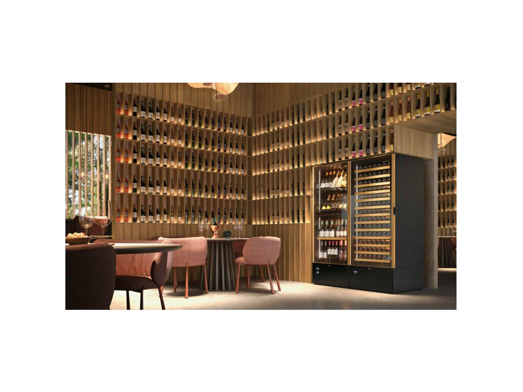 Plnoformátová vinotéka s profesionální výbavou, určená pro bary, vinotéky, restaurace a prémiové maloobchody, kde je kladen důraz na maximální kapacitu, estetický dojem a provozní účinnost. Dřevěná police dodává vitríně hřejivost, eleganci a podtrhuje její sofistikovaný vzhled. V ceně jsou 3 police na stojící láhve (každá po 65 ks). V případě zájmu je možnost zakoupení i jiných polic. Plášť je vyroben z recyklovaných materiálů, které lze po skončení životnosti opět ekologicky zpracovat.