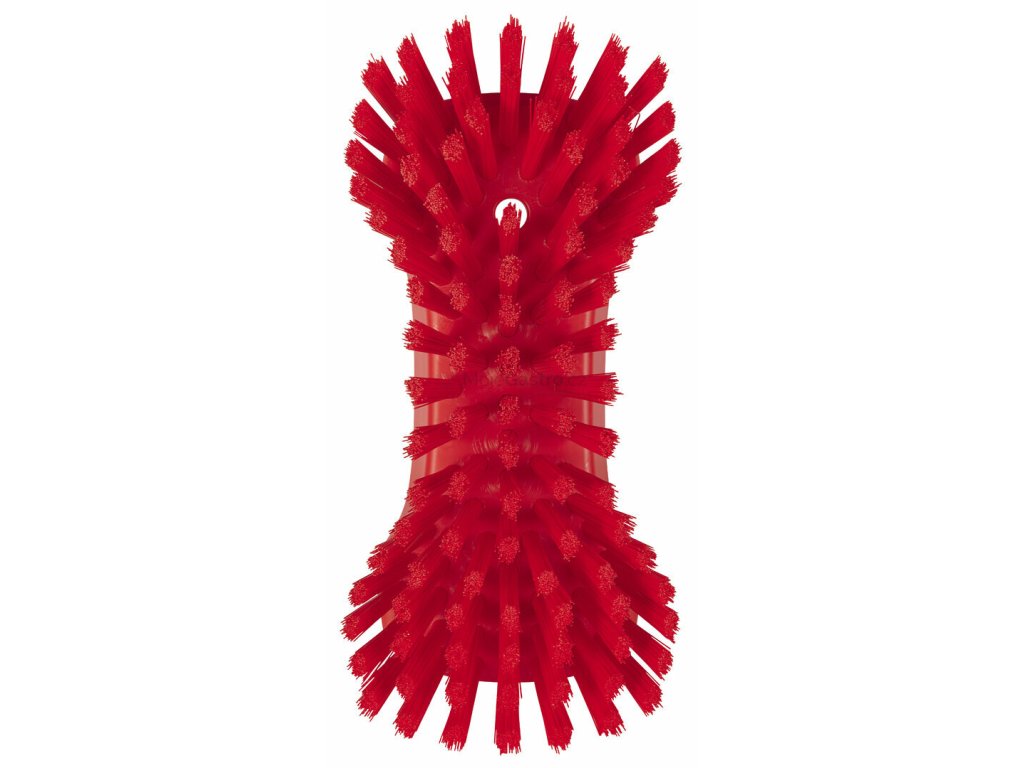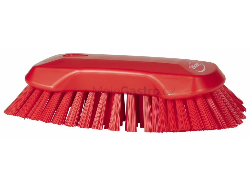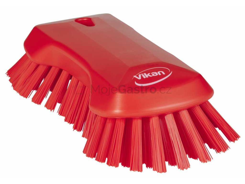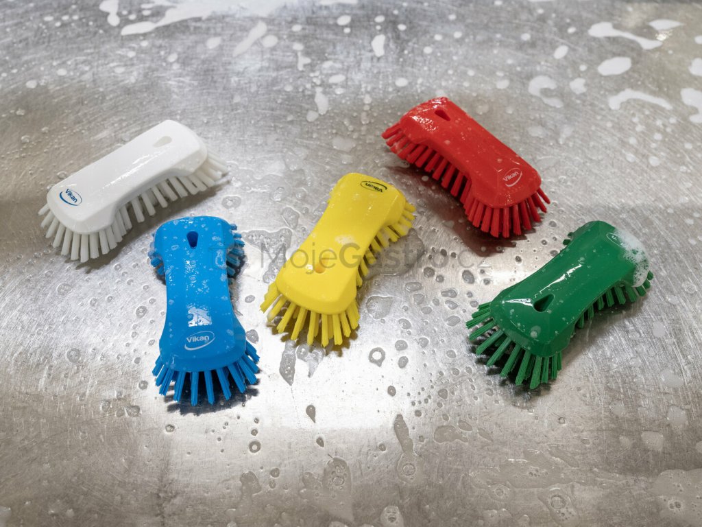 Ruční kartáč XL je velmi oblíbený v masném a mlékárenském průmyslu a díky své velikosti a tuhým štětinám odvádí působivou práci. Pokud potřebujete vyčistit větší plochy s těžko dostupnými rohy nebo mezerami, tento velký kartáč může být právě tím nástrojem, který potřebujete. Robustní kartáč se skládá z pevného bloku 29 mm. Speciální „motýlí tvar“ bloku nabízí uživateli lepší a ergonomičtější úchop. Kartáč sedí v jedné rovině s rukama většiny uživatelů, takže se pohodlně a snadno drží i při manipulaci s čisticími chemikáliemi a s mokrýma nebo mastnýma rukama. Stejně jako všechny kartáče z naší hygienické řady je i ruční kartáč Vikan XL navržen pro použití v oblastech, kde jsou vyžadovány nejvyšší standardy čistoty a hygieny. To z nich dělá ideální čisticí nástroj pro potravinářský průmysl. Hladký povrch, absence ostrých hran a šikmý, vypouštěcí otvor pro zavěšení usnadňují čištění a skladování. Ať už čistíte nádrže, stoly, dopravní pásy nebo kbelíky, ruční kartáč XL s extra tuhými štětinami vám pomůže dokončit práci rychle a efektivně.