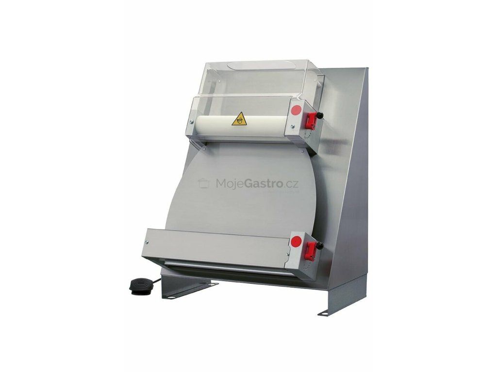 Model je komplet v robustním celonerezovém provedení, 2 páry polohovatelných plastových válců uložených paralerně nad sebou, bez tvarovacího zařízení vhodné pro hranatý tvar těsta. součástí zařízení elektrický nožní ovládací pedál