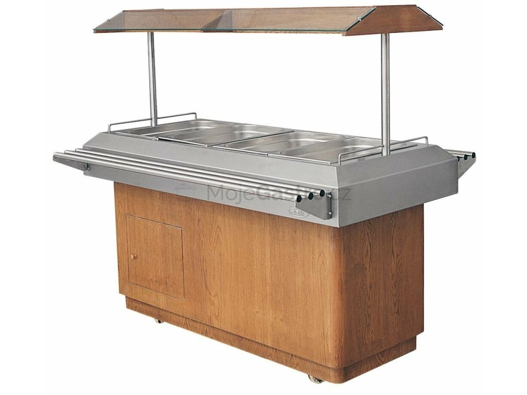 Teplé salátové bary slouží k uchování, prezentaci, a výdeji (samoobslužnému, obslužnému) připravených pokrmů. Nerezová lisovaná vana (snadná údržba a hygiena)umožňuje vkládat a kombinovat GN nádoby v rozměru 4x GN1/1 a menších s hloubkou do 150 mm. Díky pojízdnému provedení není problém tyto vozíky umístit kdekoli ve vašem provozu s možností využití dvou postranních nerezových odkládacích polic (možno sklopit, nebo zcela odebrat). Salátové vozíky jsou provedeny v imitaci ušlechtilého dřeva (O-dub a W-ořech) a nerezu. Teplota je řízena elektromechanickým termostatem umožňujícím nastavit teplotu od +70°C do +80°C.Vozíky jsou vybaveny osvětlovací rampou.