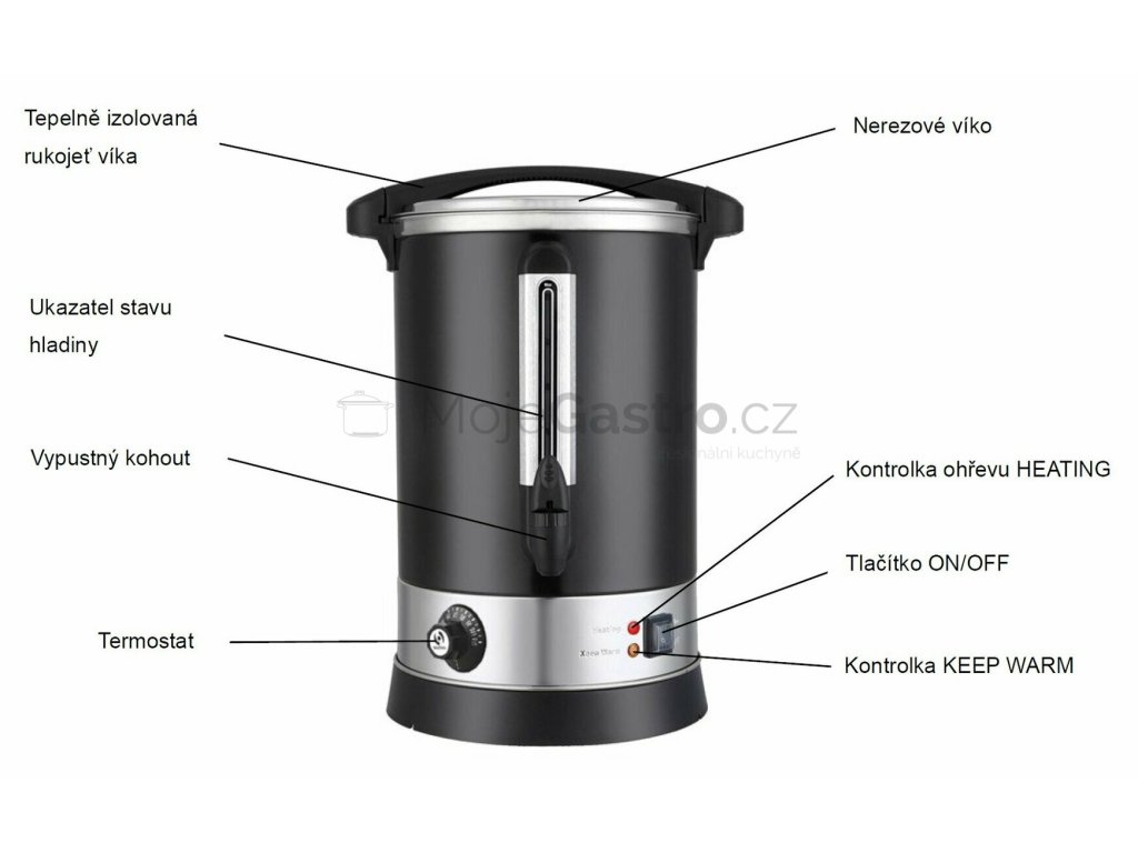 Automatické varné a udržovací termosy na přípravu a udržení horké vody a teplých nápojů. Luxusní celonerezové, dvouplášové, izolované provedení (minimální teplotní ztráty = ekonomický provoz), tělesa jsou skryta pod nerezovým dnem (snadné čistění a údržba). Automatický systém výroby horké vody, nebo udržení připravených nápojů na požadované teplotě. Výdej nápoje automatickým výpustným kohoutem a množství nápoje v termosu je přehledně indikováno na rysce hladinoměru. Snadné nastavení varné, udržovací, nebo výdejní teploty mechanickým termostatem (rozsah termostatu 30-100°C), vybaven centrálním vypínačem, kontrolkou chodu a nahřátí. Nerezové bezpečnostní víko s ergonomickým bezpečným plastovým madlem.