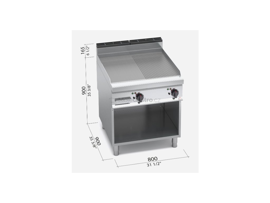 Topné těleso je umístěno pod grilovací plotnou. Deska o velké tloušťce s hladkým (rýhovaným) povrchem z oceli a zvýšenými postranními lemy. Kompaktní provedení s otevřeným podstavcem.