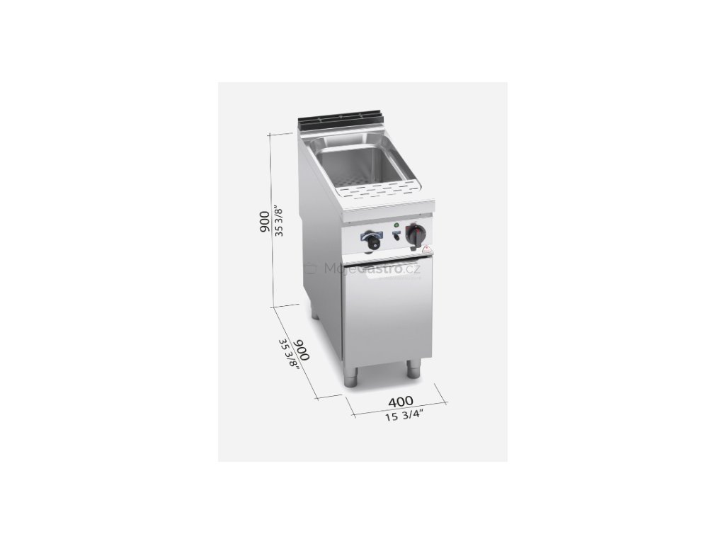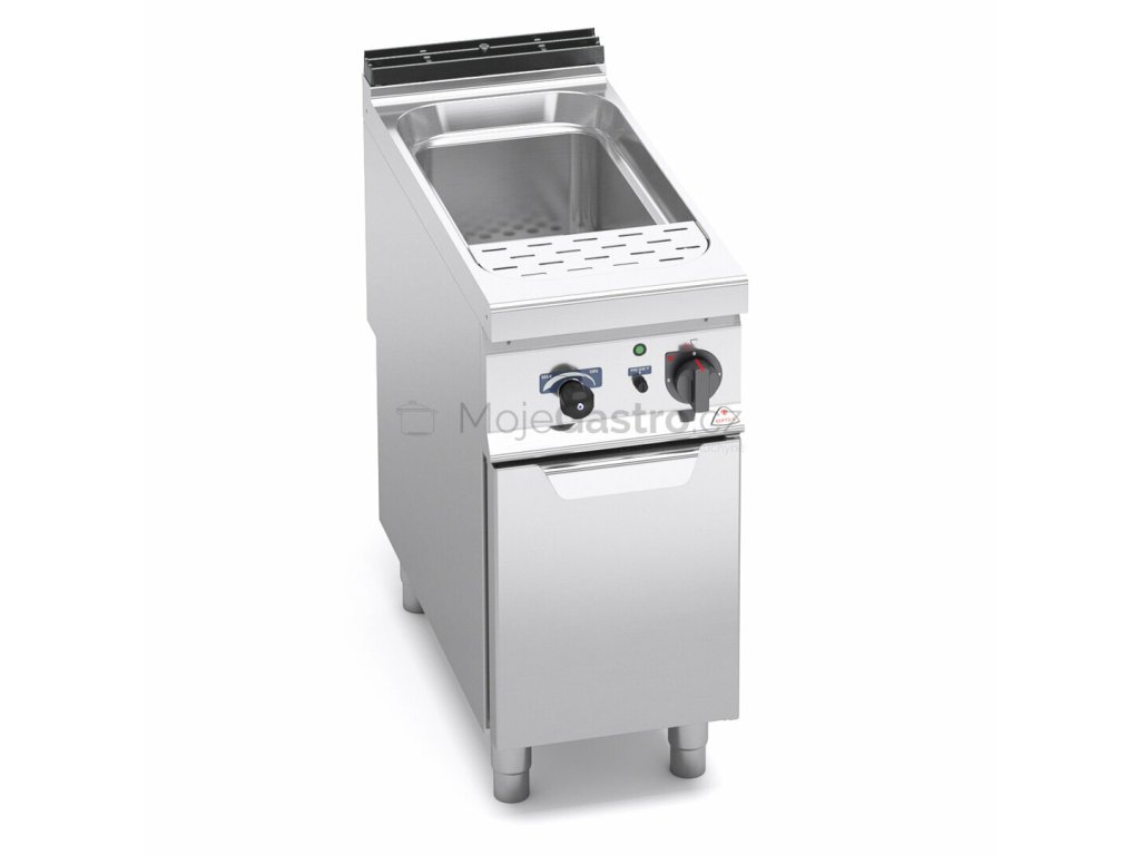 Ideální zařízení pro vaření těstovin, rýže, zeleniny a vajec díky rychlému vaření vody. K dispozici ve verzi plynové a elektrické. Přívod vody je umístěn přímo na pracovní ploše, což umožňuje snadné dopouštění, výměnu vody a odplavování nečistot přepadem. Vana je vyrobena z nerez oceli AISI 316 o objemu 40 litrů se zaoblenými hranami a vybavena vyjímatelným perforovaným dnem pro ukládání košů.