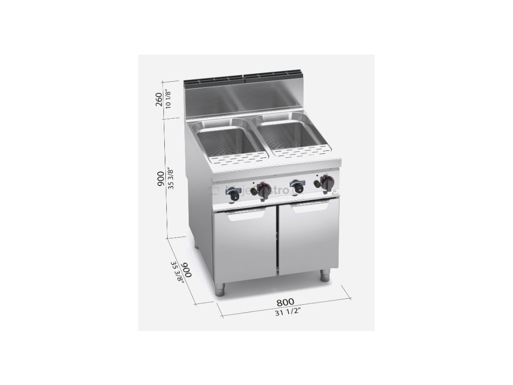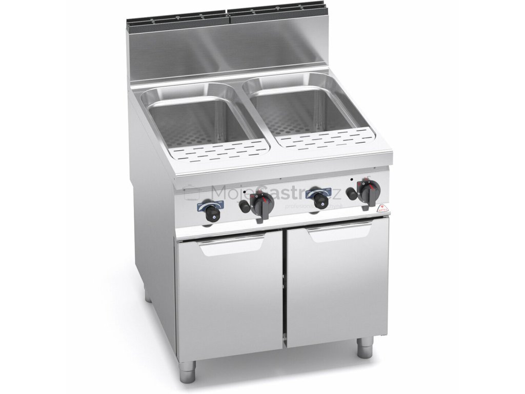 Ideální zařízení pro vaření těstovin, rýže, zeleniny a vajec díky rychlému vaření vody. K dispozici ve verzi plynové a elektrické. Přívod vody je umístěn přímo na pracovní ploše, což umožňuje snadné dopouštění, výměnu vody a odplavování nečistot přepadem. Vana je vyrobena z nerez oceli AISI 316 o objemu 40 litrů se zaoblenými hranami a vybavena vyjímatelným perforovaným dnem pro ukládání košů.