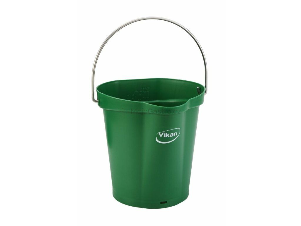 Odolné 6 litrové vědro s nerezovou rukojetí, úchytem ve dně, vnitřními kalibračními měrkami různých jednotek a výlevkou pro směrování kapaliny do jednoho proudu. Výrobek je určený pro mytí nebo skladování přísad. Zadní plocha vědra slouží pro zavěšení do nástěnného držáku Vikan 16200.